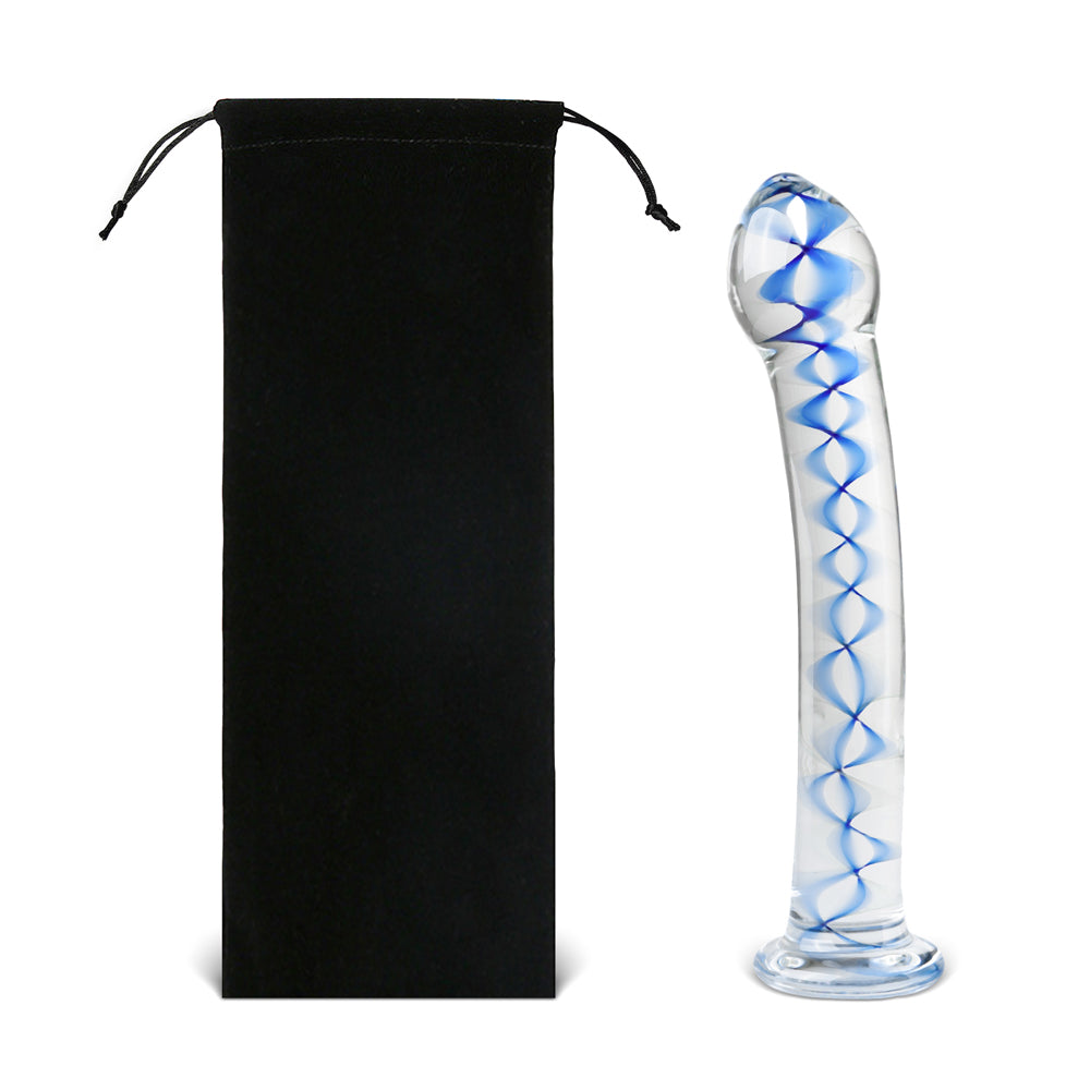 Introducing the CLEAR GLASS DILDO WITH BLUE PATTERN AND PENIS HEAD TIP, a truly unique addition to your intimate collection. Its stunning swirly blue design not only captivates the eye but also enhances your pleasure experience.